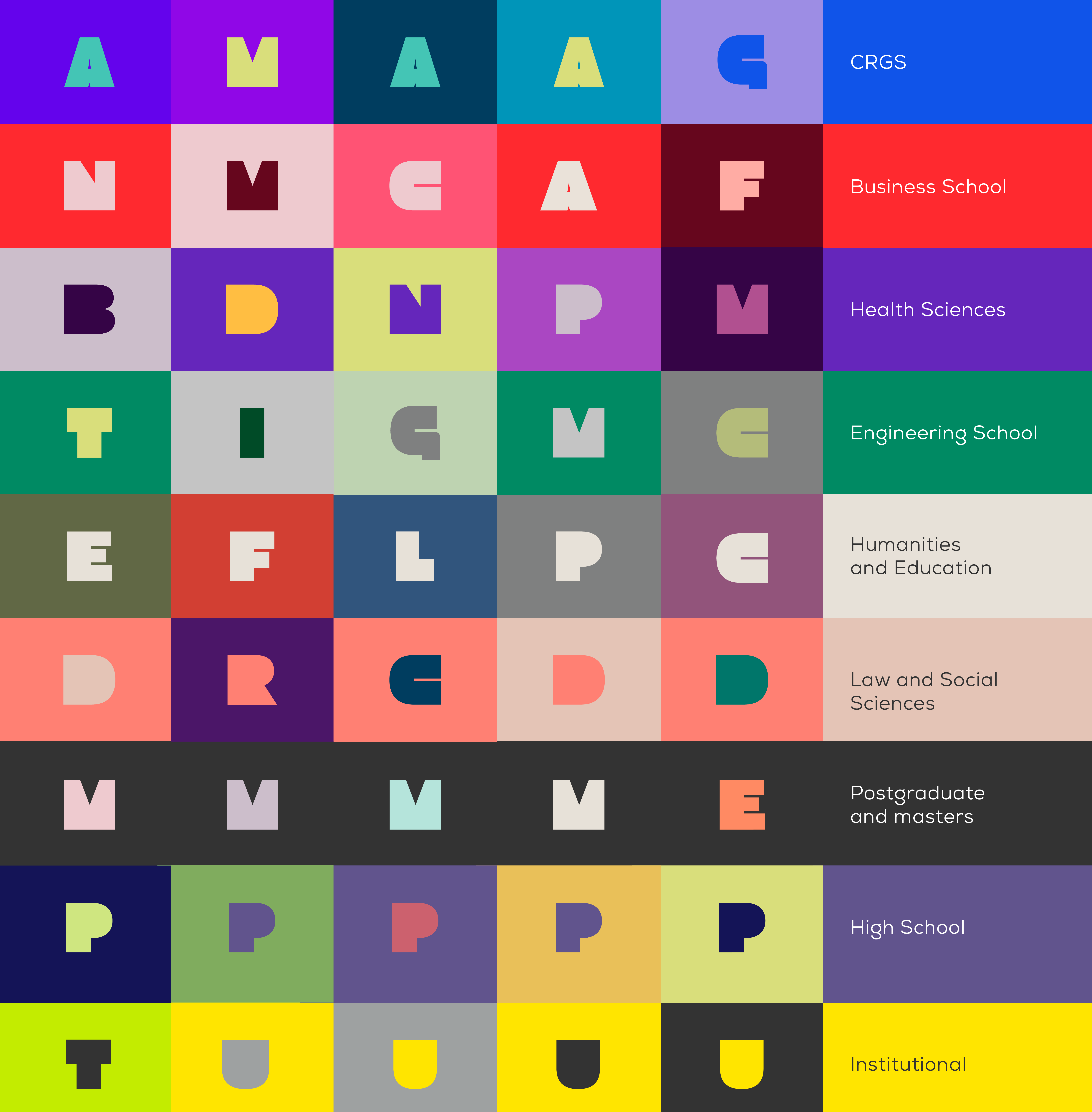 For visual communication a personalized alphabet was created based on the Work Sans typography, which was modified to create shapes that could serve as windows into the University. These windows represent the new openness of UDEM and allow people to visualize the DNA and teachings of each educational area.